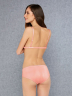 Комплект женского белья розово-кораллового цвета с кружевным бюстгальтером и шелковистыми слипами, с декором в виде узкой полоски кружева по краям.