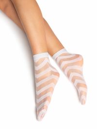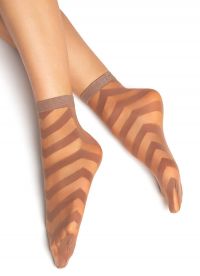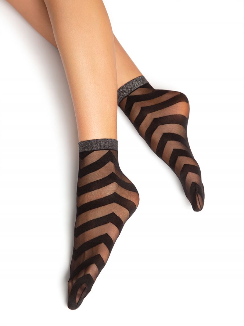 Женские носочки с рисунком в виде полосок и резинкой дополненной люрексом (с мерцающим блеском). Прозрачные, с гладким шелковистым эффектом. Свободного размера (один универсальный размер). 1 пара в упаковке. Носочки классической длины (выше щиколотки). С резинкой шириной 2.0 см. Не формованные.